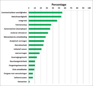 Tijdens de jaarlijkse themadag Leiderschap, in één van mijn laatste militaire functies, besloot ik uit nieuwsgierigheid een vergelijkbare enquête te houden onder de deelnemers. Ik was benieuwd of de uitkomst tot een zelfde resultaat zou leiden. Weliswaar bestond de populatie niet uit 330.000 geïnterviewden, maar altijd nog uit bijna 300 junior en senior militaire leidinggevenden. In de enquête hanteerden we de 18 Landmacht- leiderschapscompetenties. Die komen in grote lijnen overeen met de lijst van 16 people skills van Zeger en Folkman. De vraag, welke 5 competenties de meest cruciale voor de militaire leider vormen, leidde tot het volgende resultaat.